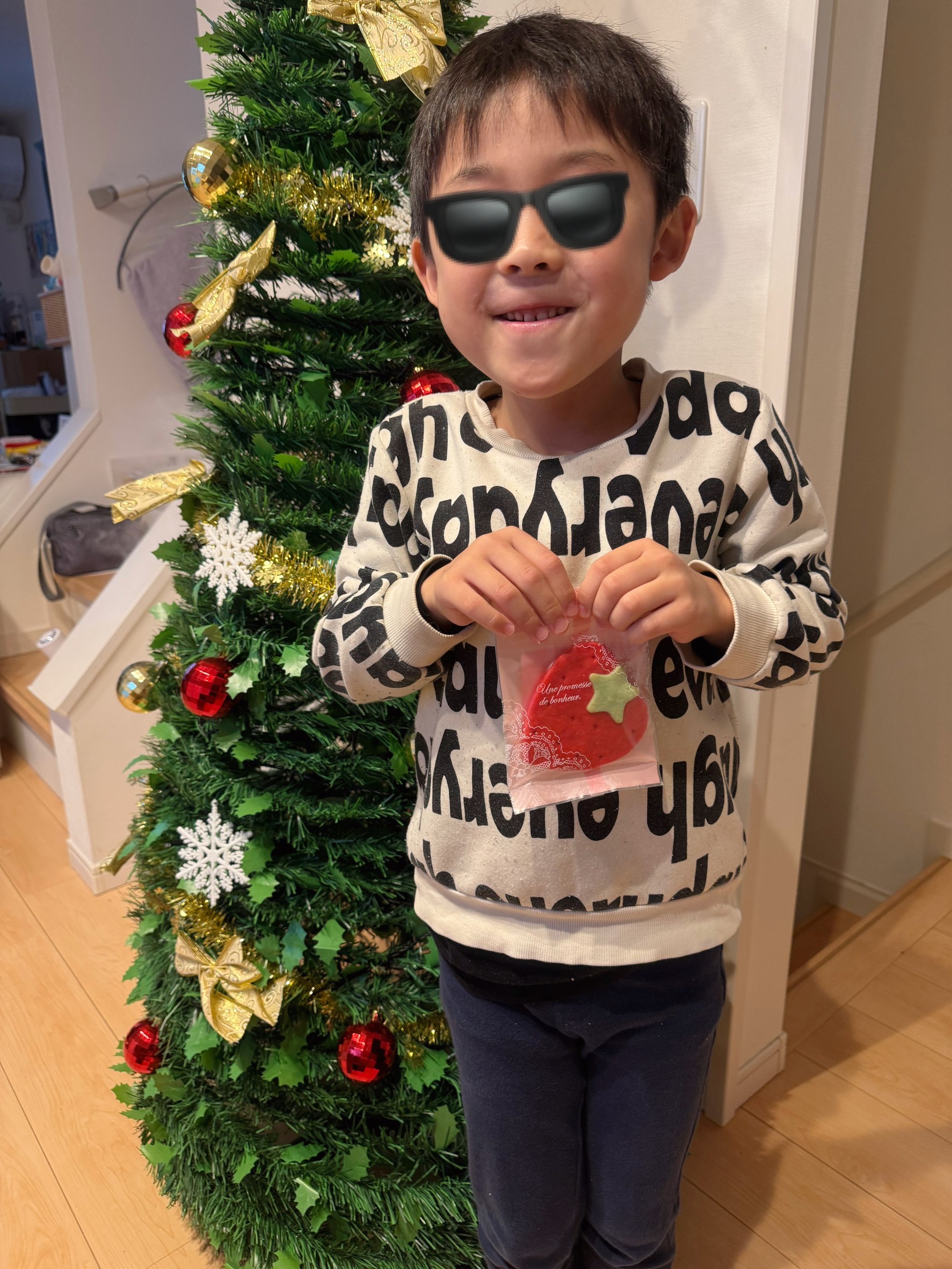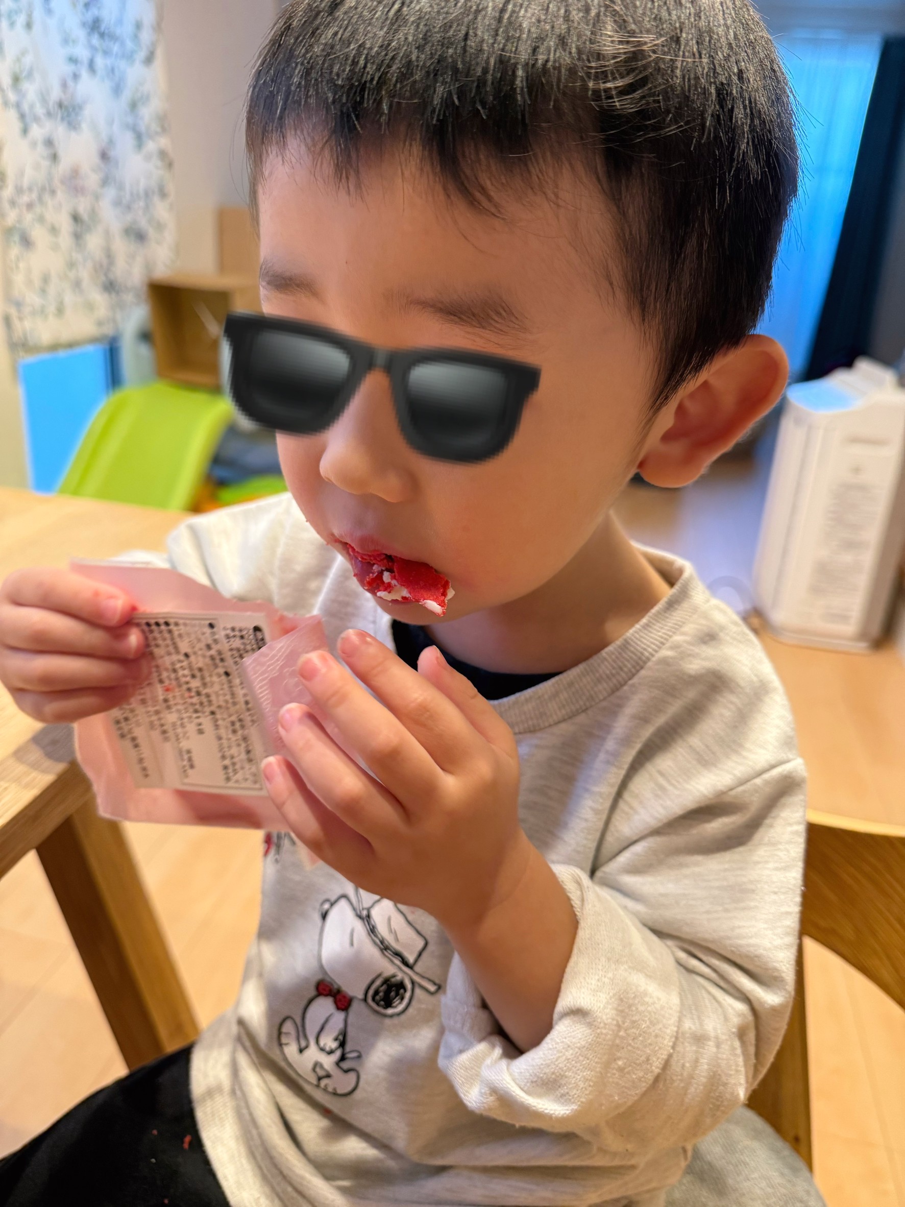 長男くんがいちごサブレを食べながら